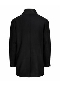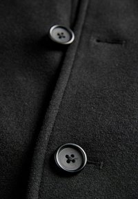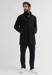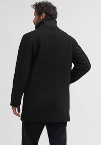 Szakállas férfi fekete bélelt dzsekit visel fekete gyapjúkabát alatt, zsebébe dugott kézzel, egyszerű háttér előtt áll.