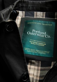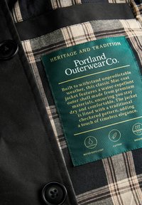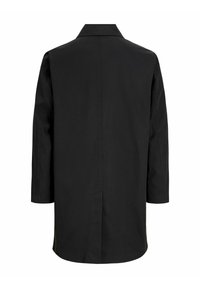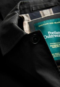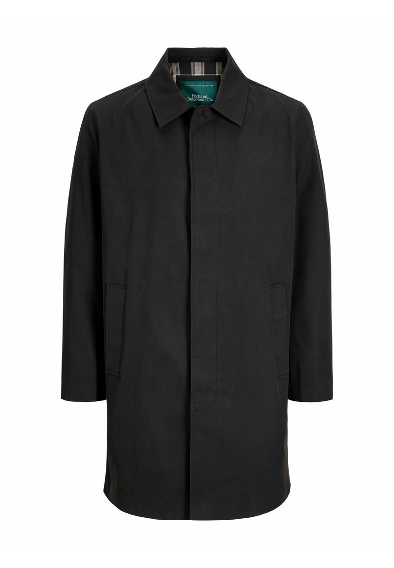 Fekete egysoros kabát rejtett gombokkal, oldalzsebekkel, klasszikus gallérral és kockás belső gallérbéléssel.