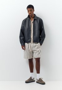 Férfi bézs rövidnadrágban fekete függőleges csíkokkal, fehér zokniban és barna, nyitott sarokkal ellátott fűzős cipőben.