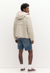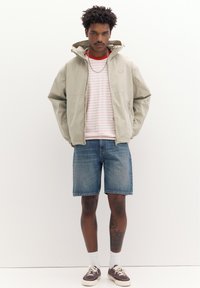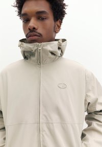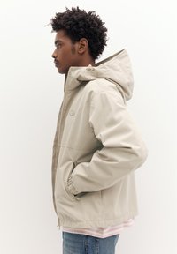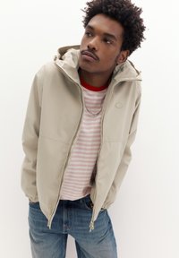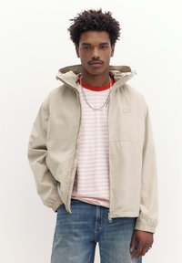 Fiatal férfi göndör hajjal, bézs kapucnis dzsekiben, rózsaszín-fehér csíkos ingben, ezüst színű lánc nyaklánccal és kék farmerral, egyszínű háttér előtt.