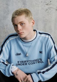 Fiatal személy rövid szőke hajjal, világoskék pulóvert visel "MINDEN ELLENŐRZÉS ALATT VAN" felirattal, fekete nadrágot, valamint ezüst nyakláncot és karkötőt.