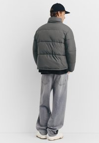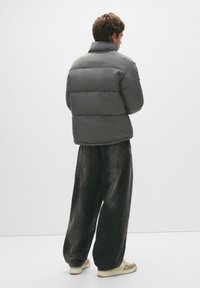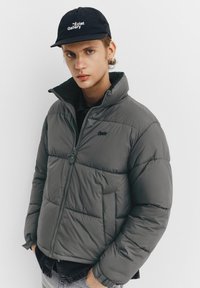 Szürke puffertöltésű dzseki magas gallérral, cipzáros záródással és steppelt mintával. Fehér pulóver és fekete farmernadrág felett viselve.
