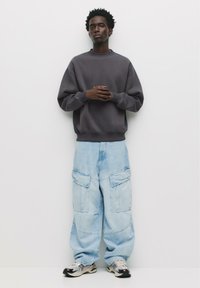 Szürke, laza szabású pulóver, bordázott nyakkal és mandzsettával, világoskék cargo nadrággal, melyen több zseb található.