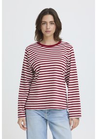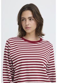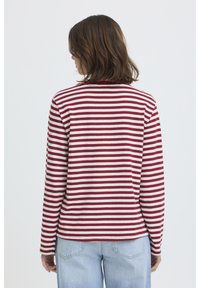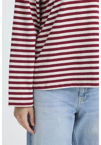 Nő áll, piros-fehér csíkos hosszú ujjú inget, világoskék, bőszárú farmert és bézs színű cipőt visel, egyszínű háttér előtt.