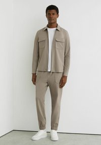 Férfi bézs zipzáras dzsekiben, melyen fedőzsebek vannak, hozzáillő bézs nadrágban, egy fehér, texturált fal előtt áll, egyik kezét a zsebébe dugva.