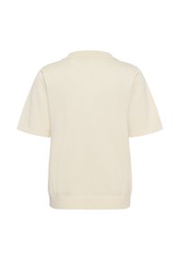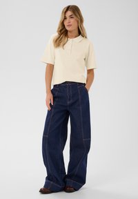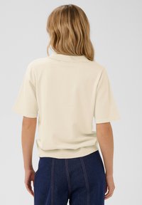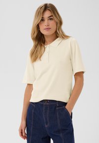 Krém színű galléros póló, klasszikus nyakkal, rövid ujjakkal és négy gombbal. Az anyag puhanak tűnik, enyhe textúrával.