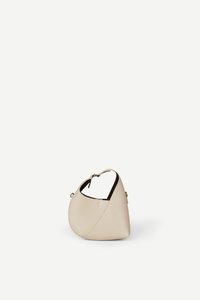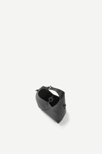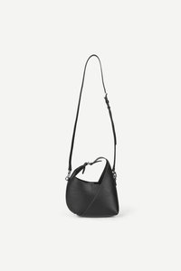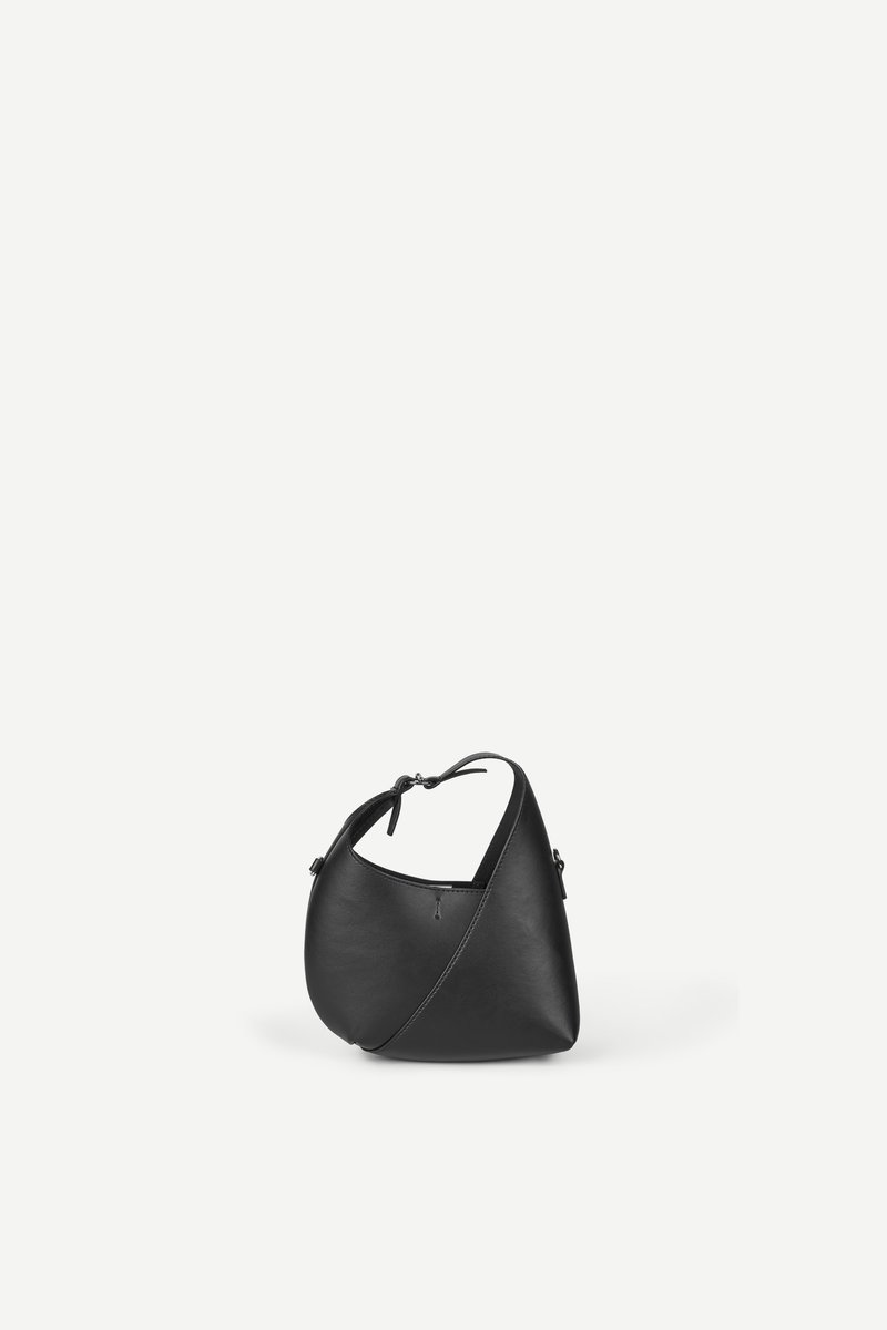 Fekete bőrből készült válltáska, lekerekített háromszög alakú, állítható pánttal, egyszínű világos háttéren.