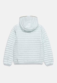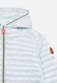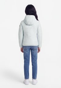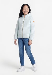 Hosszú sötét hajú lány világoskék steppelt kapucnis dzsekiben, kék farmerben és fehér tornacipőben, állva, mosolyogva, jobbra nézve.