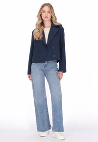 Tengerészkék kétsoros zakó nagy gombokkal, hajtókás gallérral, rövidített fazonnal és sima textúrával, világoskék farmerrel párosítva.