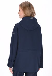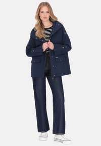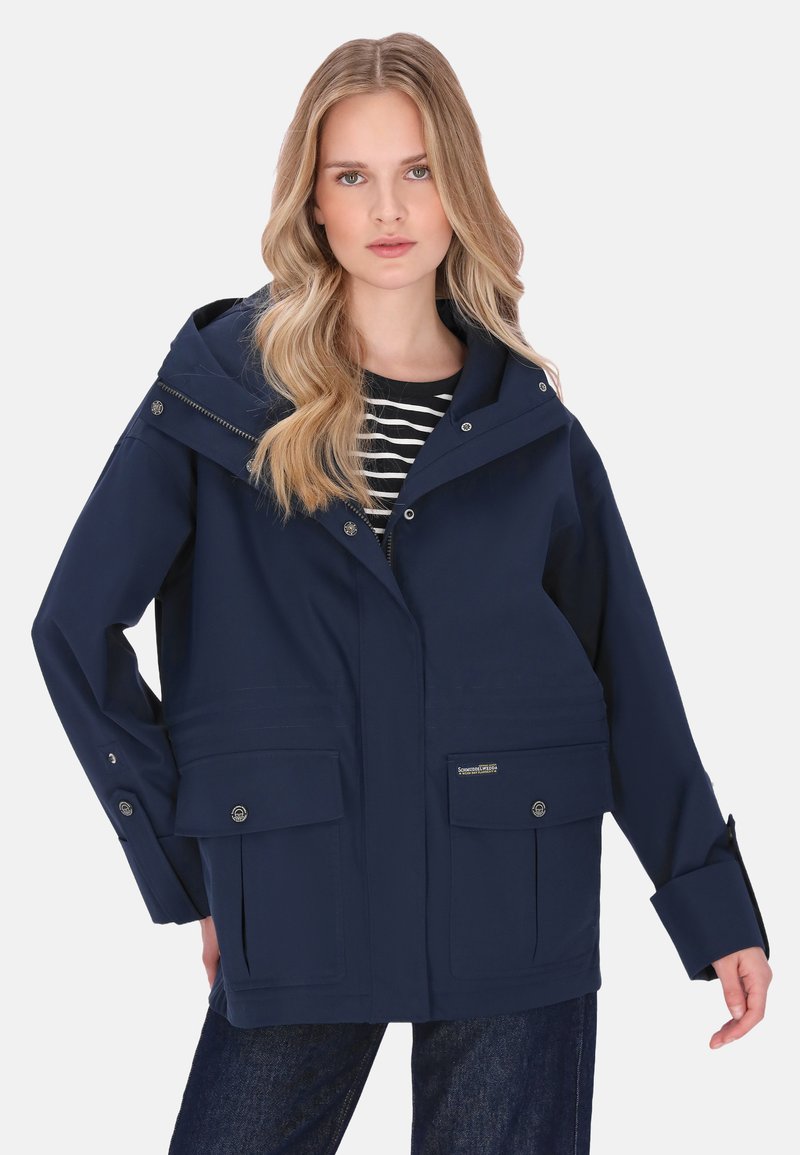 Tengerészkék vízálló dzseki kapucnival, elülső cipzárral, két nagy első zsebbel és állítható mandzsettákkal, sima, matt textúrával.