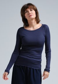 Hosszú ujjú, tengerészkék bordázott felső, kerek nyakkivágással, hullámos szegéllyel és testhezálló fazonnal, texturált, puha anyagból készült.