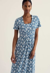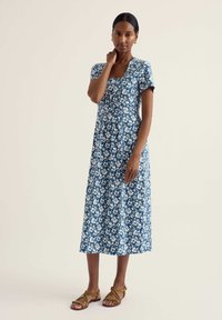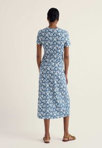 Nő áll, kék midi ruhát visel fehér virágmintával és barna pántos lapos szandált, egyszínű világos háttér előtt.