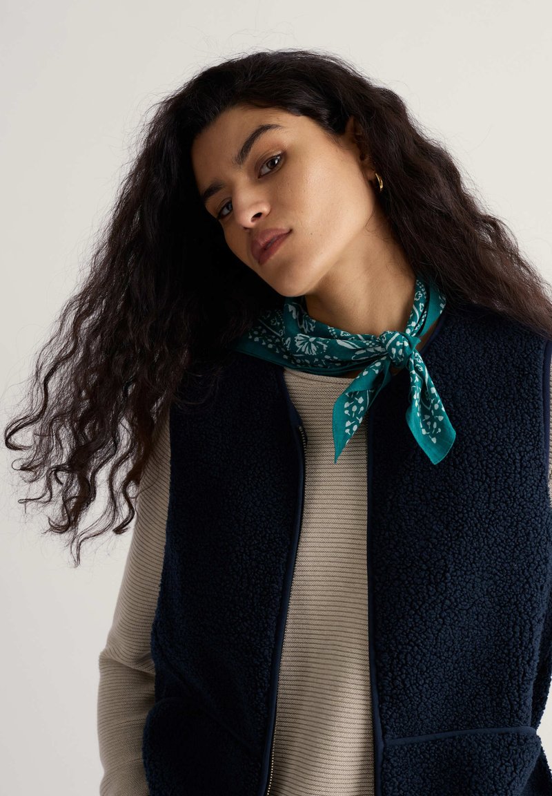 Tengerészkék polár mellény texturált felülettel és zsebekkel, bézs bordázott pulóver fölött rétegezve. A türkiz sál kontrasztos virágmintát ad hozzá.