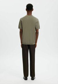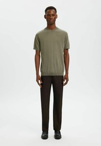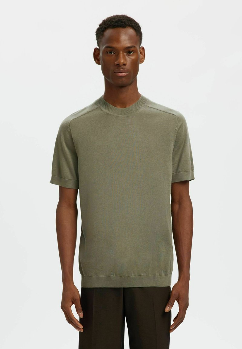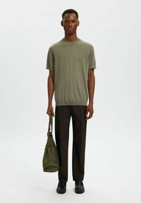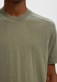 Olíva zöld, rövid ujjú kötött pulóver kerek nyakkivágással. Simább textúrájú, a gallérnál és az alján finom bordázott részletekkel.