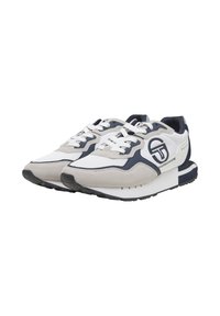 Fehér, szürke és fekete Sergio Tacchini sportcipő fűzős kialakítással, oldalon logóval és vastag párnázott talppal, jobb profilból ábrázolva.