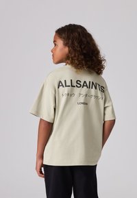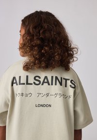 Göndör hajú gyermek oldalra fordulva, bézs ALLSAINTS pólót visel fekete felirattal és japán karakterekkel a hátoldalán.
