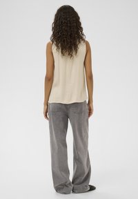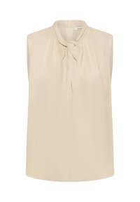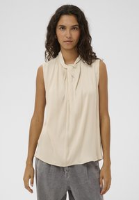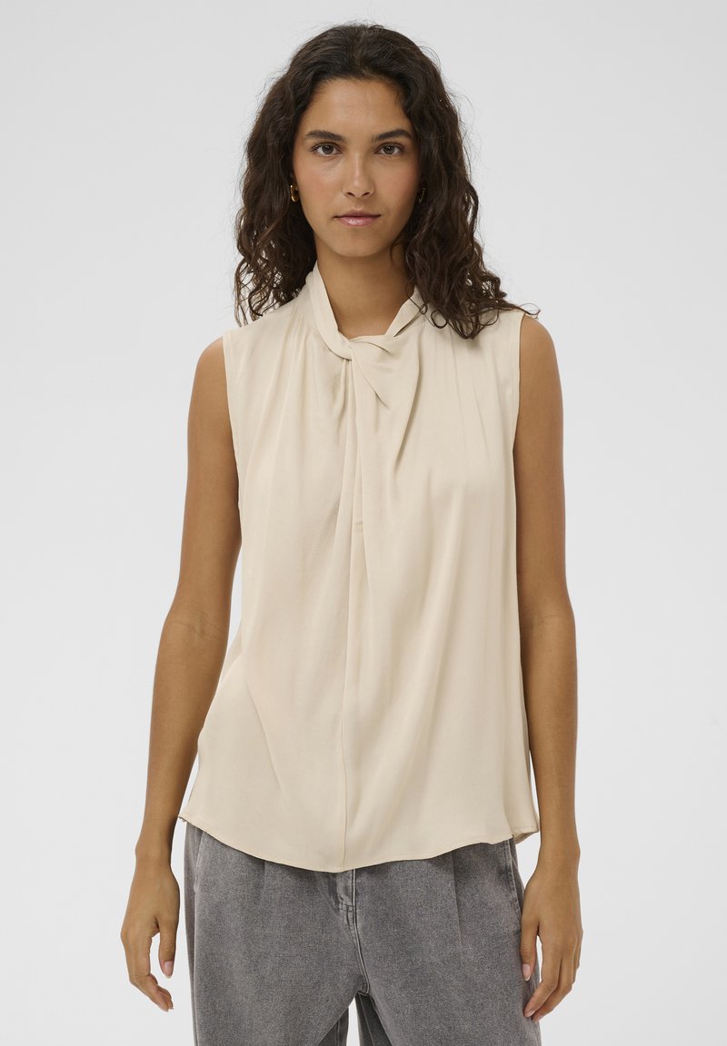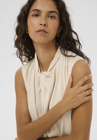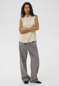 Bézs színű ujjatlan blúz, amelynek drapírozott, csomózott nyakvonala van, puha tapintású és bő szabású, szürke magasderekú nadrággal párosítva.