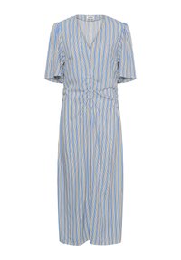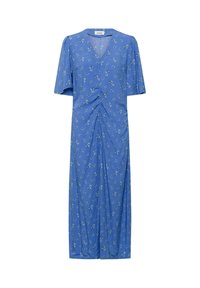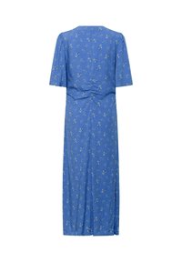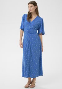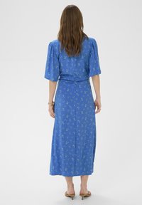 Nő áll kék, virágos midi ruhában, könyökig érő ujjakkal és barna lapos szandálban, balra néz.