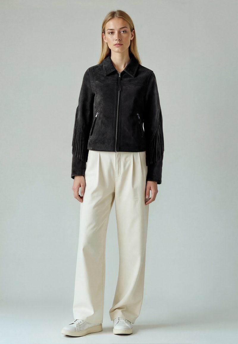 Nő fekete velúr bojtokkal díszített dzsekit, fehér bőszárú nadrágot és fehér tornacipőt visel, egyszerű világosszürke háttér előtt áll.