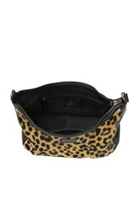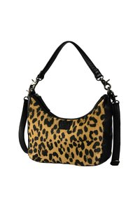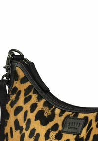 Kis kézitáska sárga és fekete leopárdmintával, fekete bőrfogantyúkkal és ezüst csatokkal, fehér háttéren.