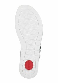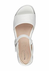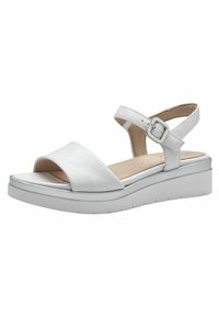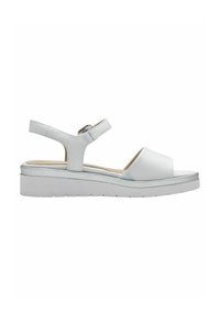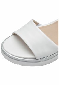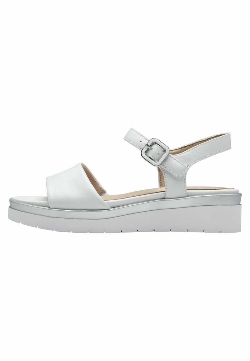 Fehér bőrszandál széles lábujjszíjjal, állítható bokapánttal és vastag talpbetéttel. Simább textúrájú, ezüst díszítéssel.