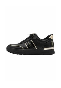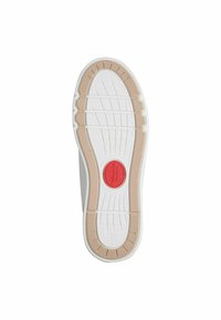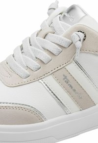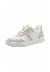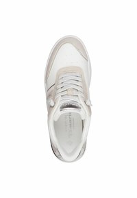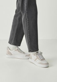 Fehér sportcipők világos bézs díszítésekkel. Texturált felsőrésszel, fűzőrendszerrel és fémes sarokdísszel rendelkeznek. Sötét farmerrel párosítva.