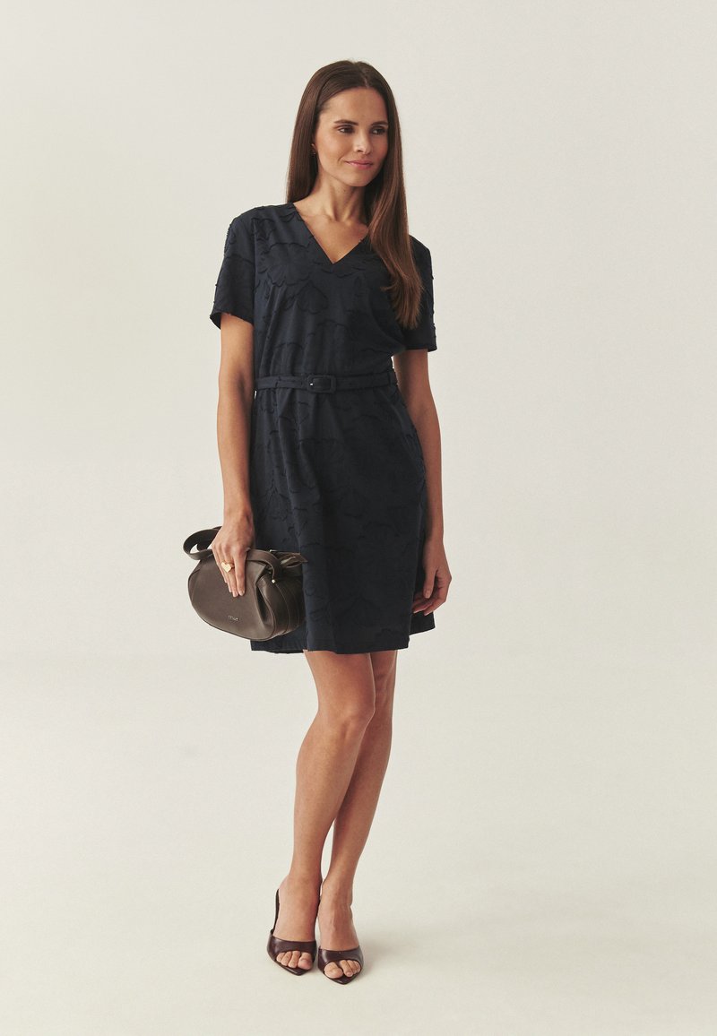 Nő sötétkék, rövid ujjú öves ruhában, sötétbarna kézitáskát tartva, nyitott orrú magassarkú cipőben világos háttér előtt.