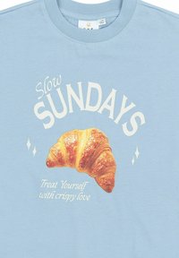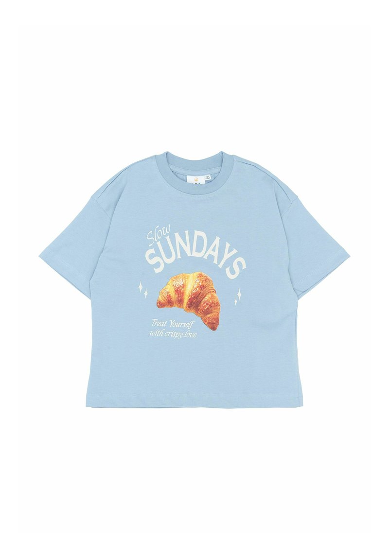 Világoskék, túlméretezett pamut póló rövid ujjakkal. Keresztmetszetben egy croissant grafika található, valamint a "Lassú VASÁRNAPOK" felirat, alatta további szöveggel.