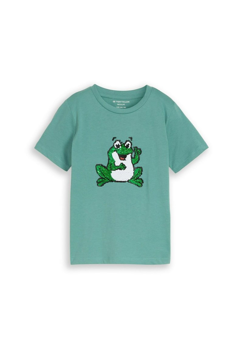 Zöld rövid ujjú gyerekpóló, elöl mosolygó béka grafikával, flitterekből.