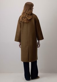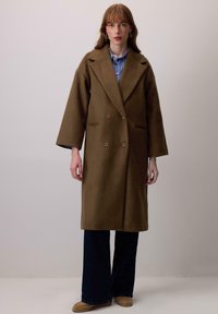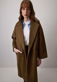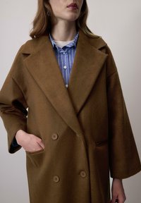 Nő barna kabátban és sállal, kék csíkos ing és fehér felső fölött, zsebre tett kézzel pózol egyszerű háttér előtt.