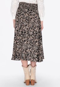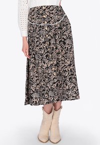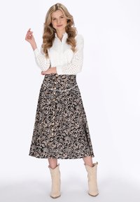 Nő fekete midi szoknyában, bézs virágmintákkal, gombos elülső résszel, fehér lyukacsos blúzzal és bézs bokacsizmával.