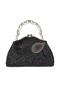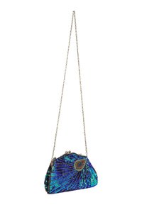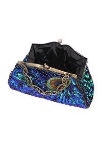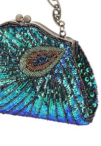 Kézi táska kék és zöld flitterekkel díszítve, pávatoll mintával, díszes aranyszínű fém fogantyúval.