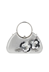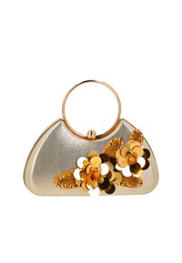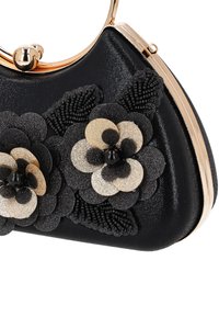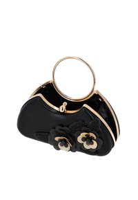 Fekete esti táska arany kör alakú fogantyúval és fekete-arany 3D virág díszítéssel elöl.