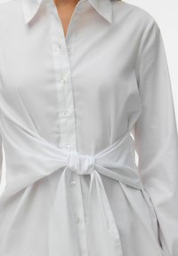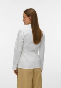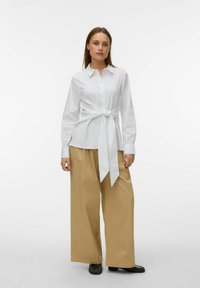 Nő fehér, derekán masnival megkötött, gombos blúzban, bézs nadrággal, egyszínű világos háttér előtt állva.