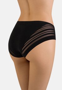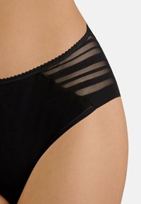 Fekete, magas derekú bugyi, sima anyagból készült, oldalt áttetsző csíkos díszítéssel és fodros derékkal.