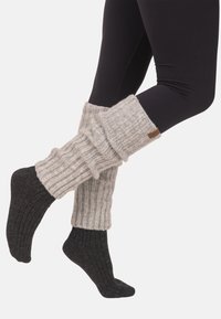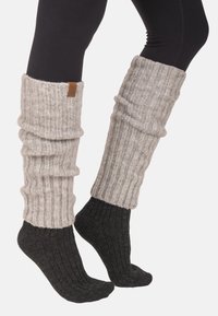 Hosszú, bordázott szürke kötött lábszármelegítőt viselő lábak barna bőr márkajelzéssel, fekete leggingshez párosítva.