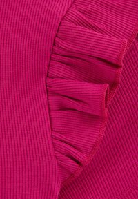 Fukszia rövid ujjú felső bordázott textúrával és fodros részletekkel a vállakon, magas derekú szürke farmernadrággal párosítva.