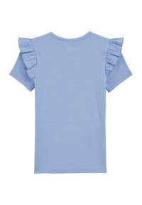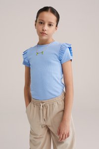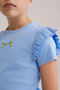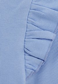 Világoskék bordázott rövid ujjú felső fodros vállrész díszítéssel, bézs elasztikus derékpántos nadrággal, oldal zsebekkel párosítva.