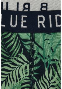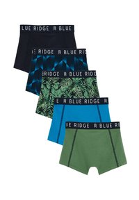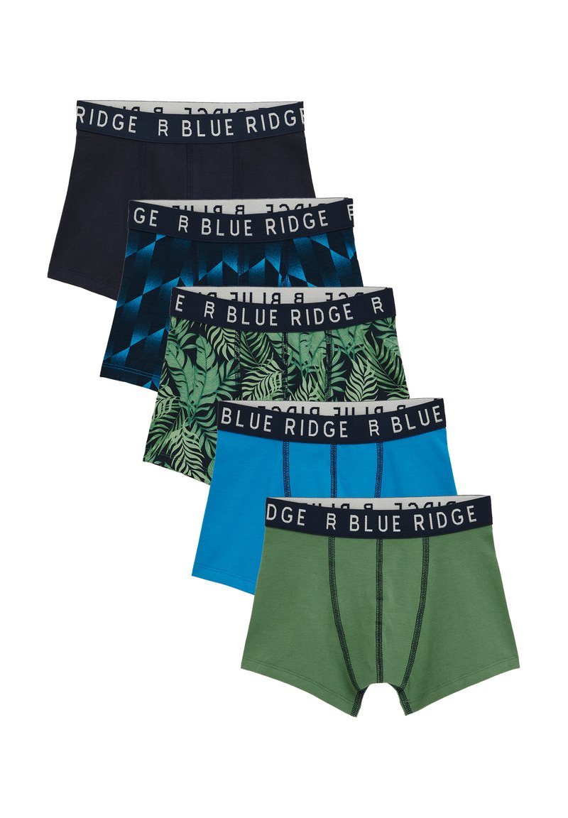 Öt pár férfi boxeralsó: tengerészkék, türkiz, geometrikus mintás, lombos és zöld színű. Puha pamut, elasztikus derékpánttal, amelyen a „BLUE RIDGE” logó látható.