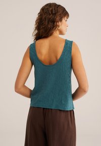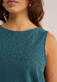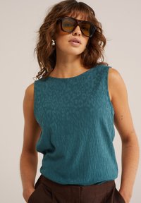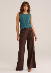 Barna hullámos hajú nő, ujjatlan türkiz mintás felsőt és magas derekú barna nadrágot visel, kezeit a háta mögött tartva áll.