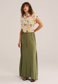 Nő színes, absztrakt virágmintás, rövid ujjú felsőt visel és olajzöld szoknyát, kezét a háta mögött tartja.
