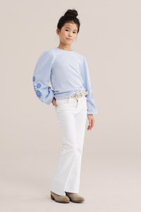 Fiatal lány sötét hajjal, kontyban, kék-fehér csíkos hosszú ujjú felsőt visel, amelyen virágmotívumos hímzés található az ujjakon, és fehér nadrágot.