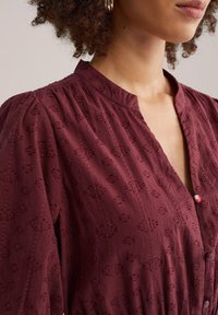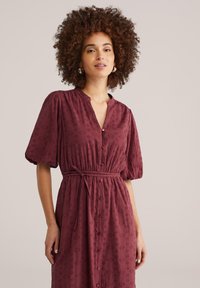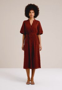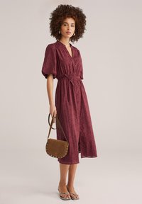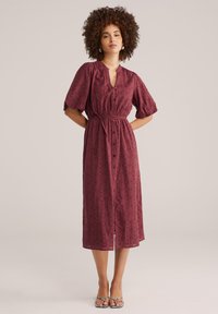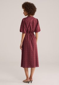 Nő áll, visel egy bordó gombos midi ruhát, amelynek puffos ujjai és vékony derékpántja van, nyitott orrú szandállal párosítva.