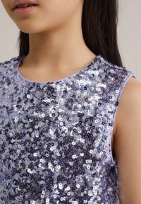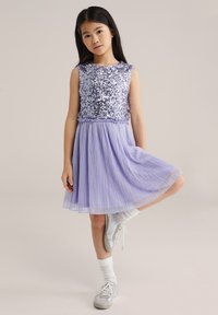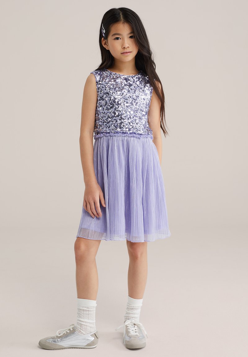 Levendulalila ruha flitteres felsőrésszel és pliszírozott szoknyával, ezüst tornacipővel és fehér texturált zoknival párosítva.