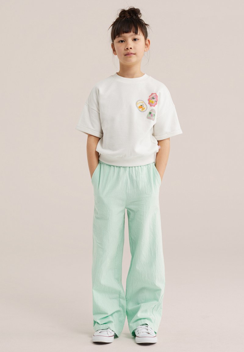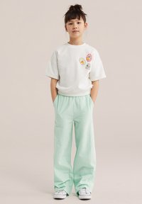 Sötét haját kontyba tűzött fiatal lány, fehér, virágos foltokkal díszített pólóban, világoszöld, bőszárú nadrágban és fehér tornacipőben, zsebébe dugott kézzel áll.