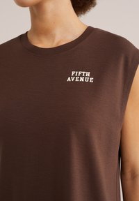 Fiatal nő göndör hajjal, barna ujjatlan felsőben, amelyen az "Ötödik sugárút" felirat olvasható, és fehér nadrágban, egyszínű bézs háttér előtt áll.