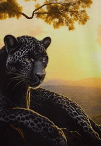Fekete párduc pihen egy sziklán, háttérben naplemente és fák, nyomtatva egy rövid ujjú, kerek nyakú pólóra.
