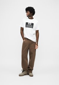Vitiligo-val élő fiatal férfi, fehér "Weekend Offender" feliratú pólóban és barna nadrágban, világos szürke egyszínű háttér előtt állva.