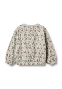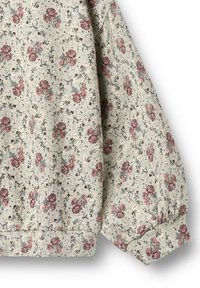 Világosszürke virágmintás pulóver, apró rózsaszín rózsákkal. Kerek nyakú, összegyűrt ujjak és testhez simuló alsó része van. Puha, texturált anyag.