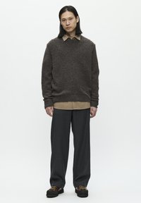 Barna textúrájú pulóver kerek nyakkal, világos bézs galléros ing fölött; sötét, fazonra szabott nadrággal viselve. Hétköznapi réteges megjelenés.